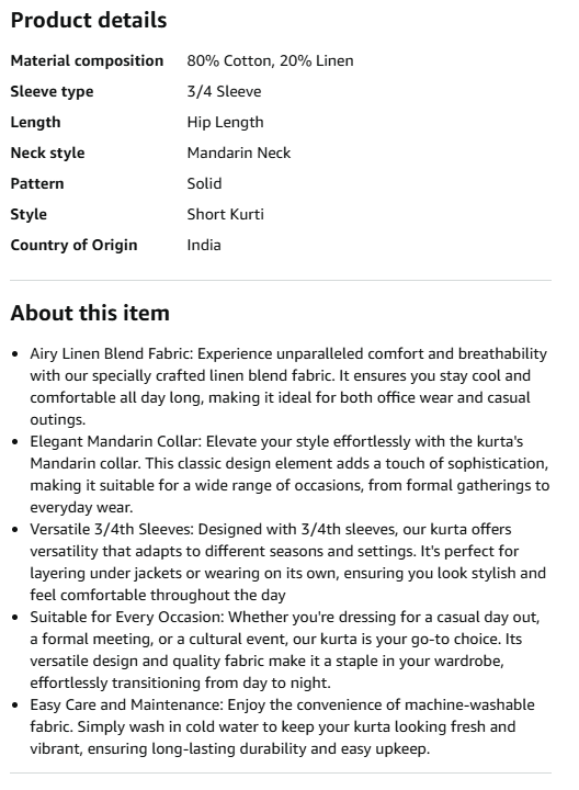 Women Short Kurti Airy Linen Regular Fit Kurta with 3/4th Sleeves, Mandarin Collar, Side Slit Perfect for Casual, Formal, and Ethnic Wear
