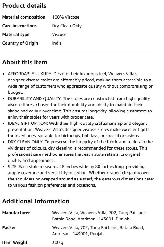 Weavers Villa Women's 100% Soft Viscose Woven Women's Scarf