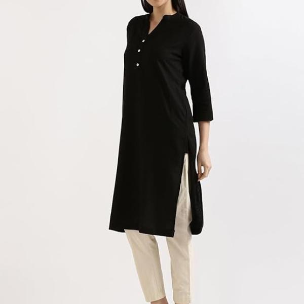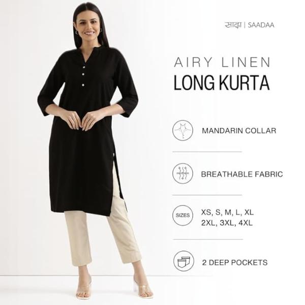 Women's Linen Straight Fit Straight Long Kurta Airy Plain Kurta, 3/4 Sleeve, Knee Length Kurtis with Pockets, Casual and Office Wear